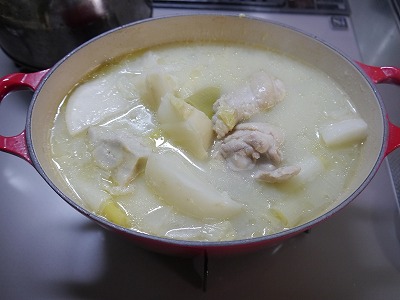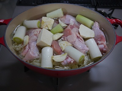 材料は、手羽元、1センチ角に切った白菜、輪切りにした長ネギ、八つ頭(もしくは里芋)。