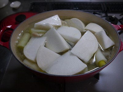 野菜はいろいろ。白菜、かぶ、長ネギ、八つ頭。