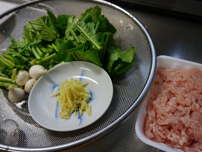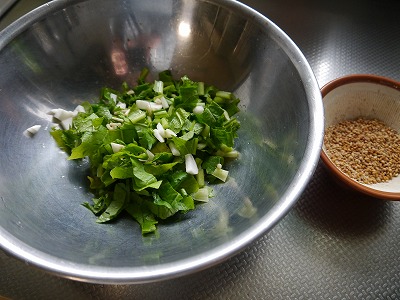 かぶとベーコンとにんにくを先にオリーブオイルでソテーし、青い葉を投入します。
