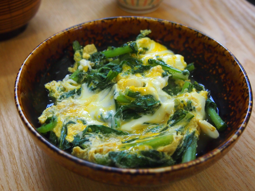 左は、かぶのまびき菜のお吸い物です。黄色、緑、白の3色がかわいらしいと思い、出汁巻き卵を入れてみました。出汁でかぶのまびきを煮、薄口しょう油でお吸い物をつくり、よそいます。そのお椀に出汁巻き卵を入れます。