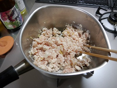続いて挽き肉も入れ、酒、塩をふって箸でほぐしながら炒めます。