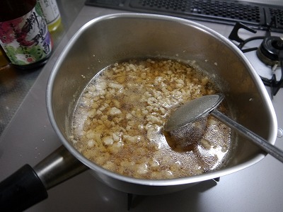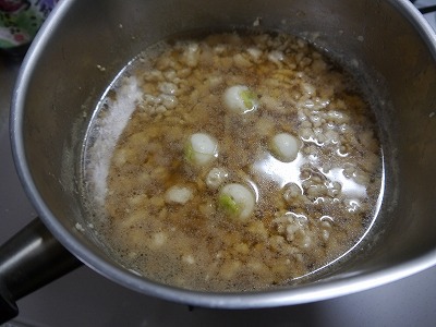 水、みりん、しょうゆ、塩を入れアクをとりながら煮ます。