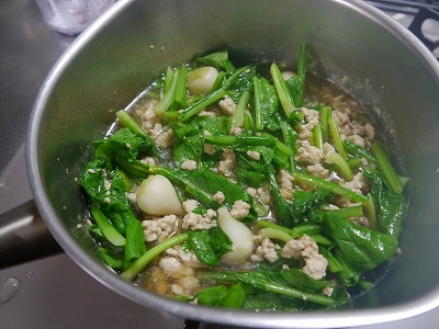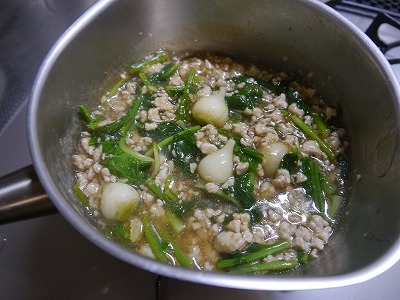 なっぱに火が通ったら水溶き片栗粉でとろみをつけて、
