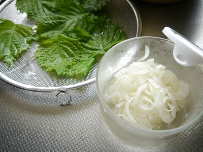 写真は青じそと玉ねぎ薄切り(繊維と直角に)に塩と酢をして一晩おいたもの。