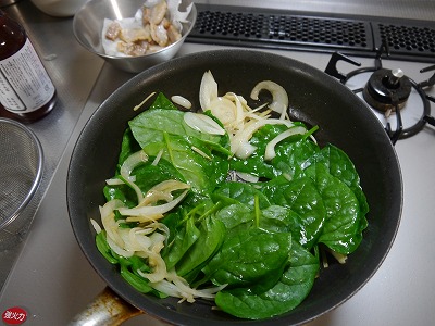 つづいて玉ねぎ薄切りを炒め、つるむらさきも加えます。