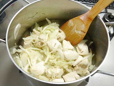 続いて玉ねぎ鶏肉も加え、塩・酒を振ってさらに炒めます。