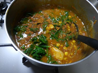 最後にゆでたつるむらさきとガラムマサラを加えて出来上がり。