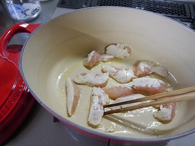 オリーブオイルで炒めたら、酒をふって、