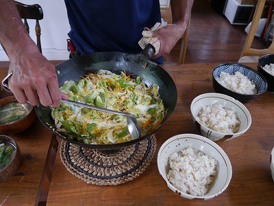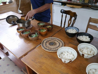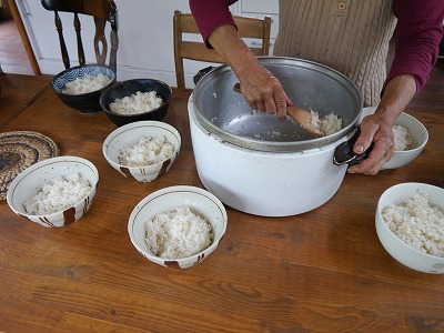 どんぶりに盛られていく7分つき白米。つくってくれたのはノブコさん。