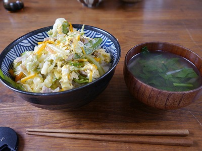 野菜丼はキャベツ、にんじん、絹サヤ、豚肉、、卵でとじてボリュームまんてん!