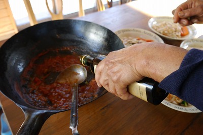 トマトソースにかけているのはヨルダン産オーガニックオリーブオイル。