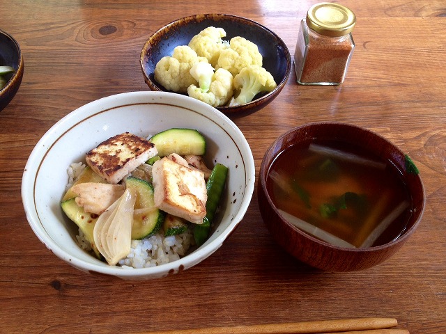 ズッキーニ、玉ねぎ、絹さや、豆腐、鶏肉が炒めてあります。