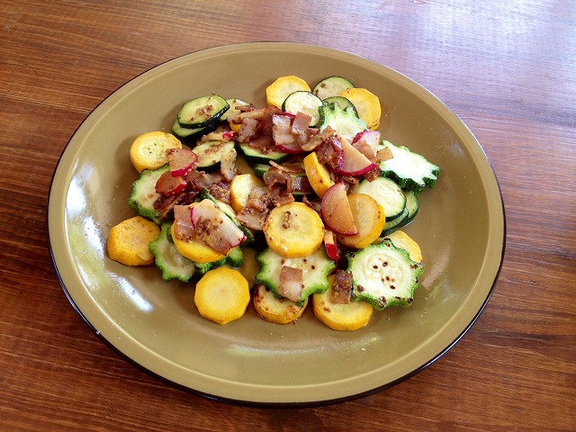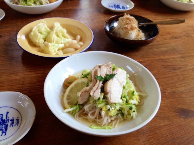 ひやむぎのおともはズッキーニの炒めもの。黄色と緑がきれい。