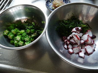 オクラのほうは食べるまえにすりゴマと醤油をかけて。