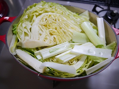 塩、水、酒、白ねぎを入れて無理やりフタをして火にかけます。