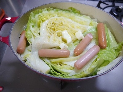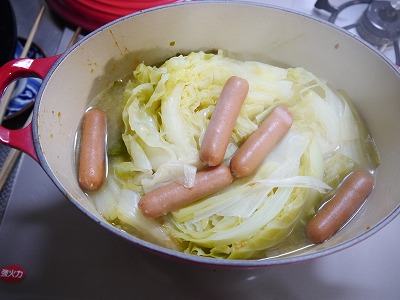 少しかさが減ったのでソーセージを入れます。