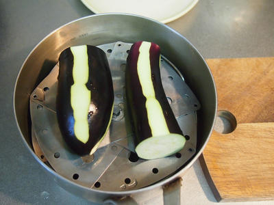 なすは鍋(蒸し器)に入る長さに切って、縞に皮をむきます。