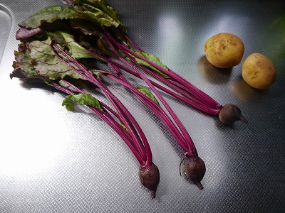 葉っぱはおとして皮付きのまま。じゃがいもも皮付きで半分にきってます。