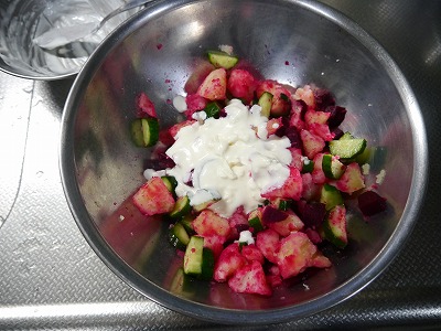 塩をして冷めたら塩もみきゅうりも加えます。