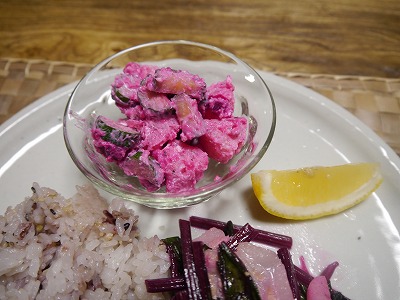 サラダはすごい色だけどレモンも効いてさっぱりおいしい。