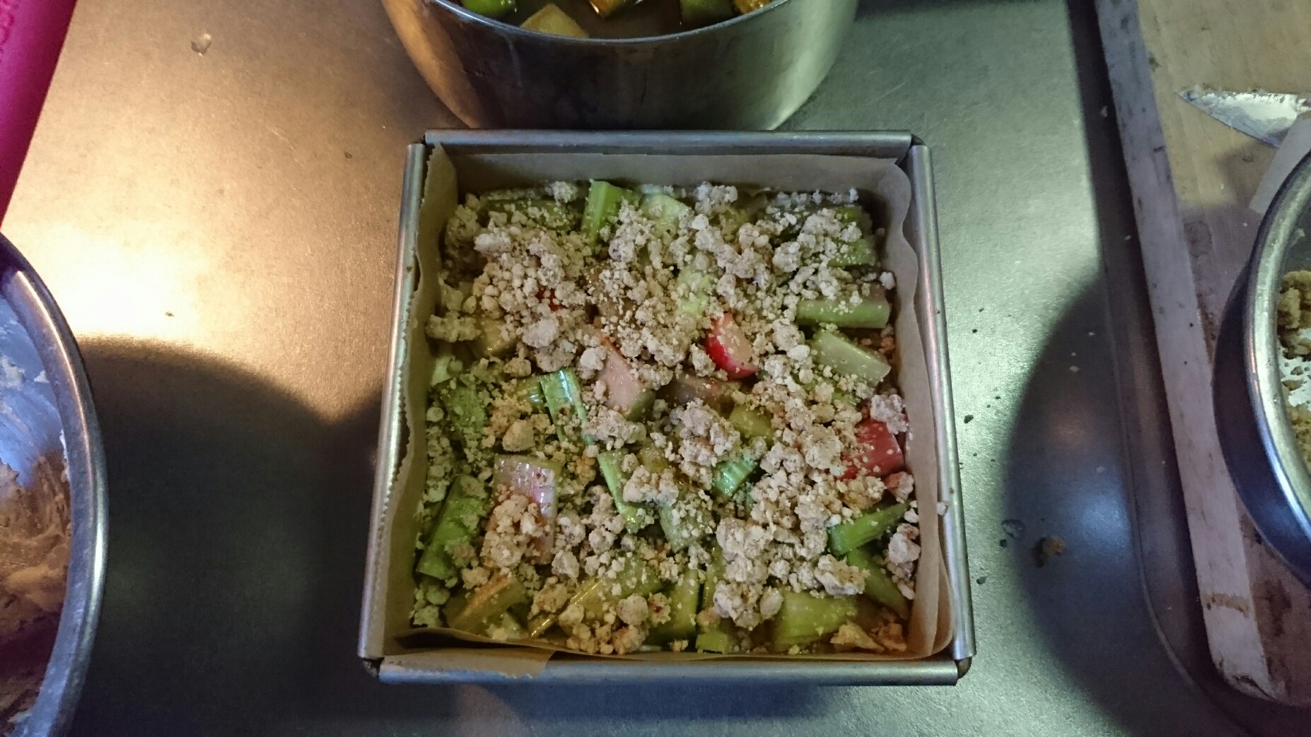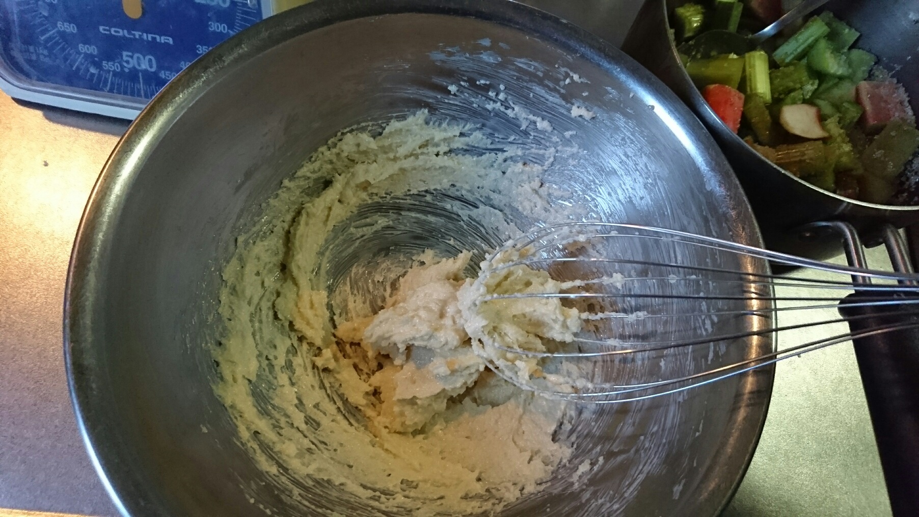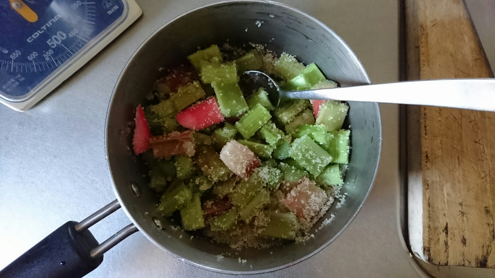 1.ルバーブを2センチくらいに切って他のミクスチャの材料とまぜておきます。