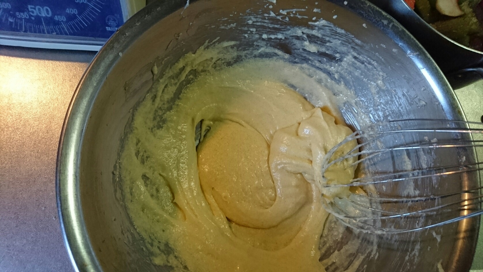 2.<生地のその他の材料>のバターに砂糖を加え、泡だて器でとろんとするまで混ぜます。