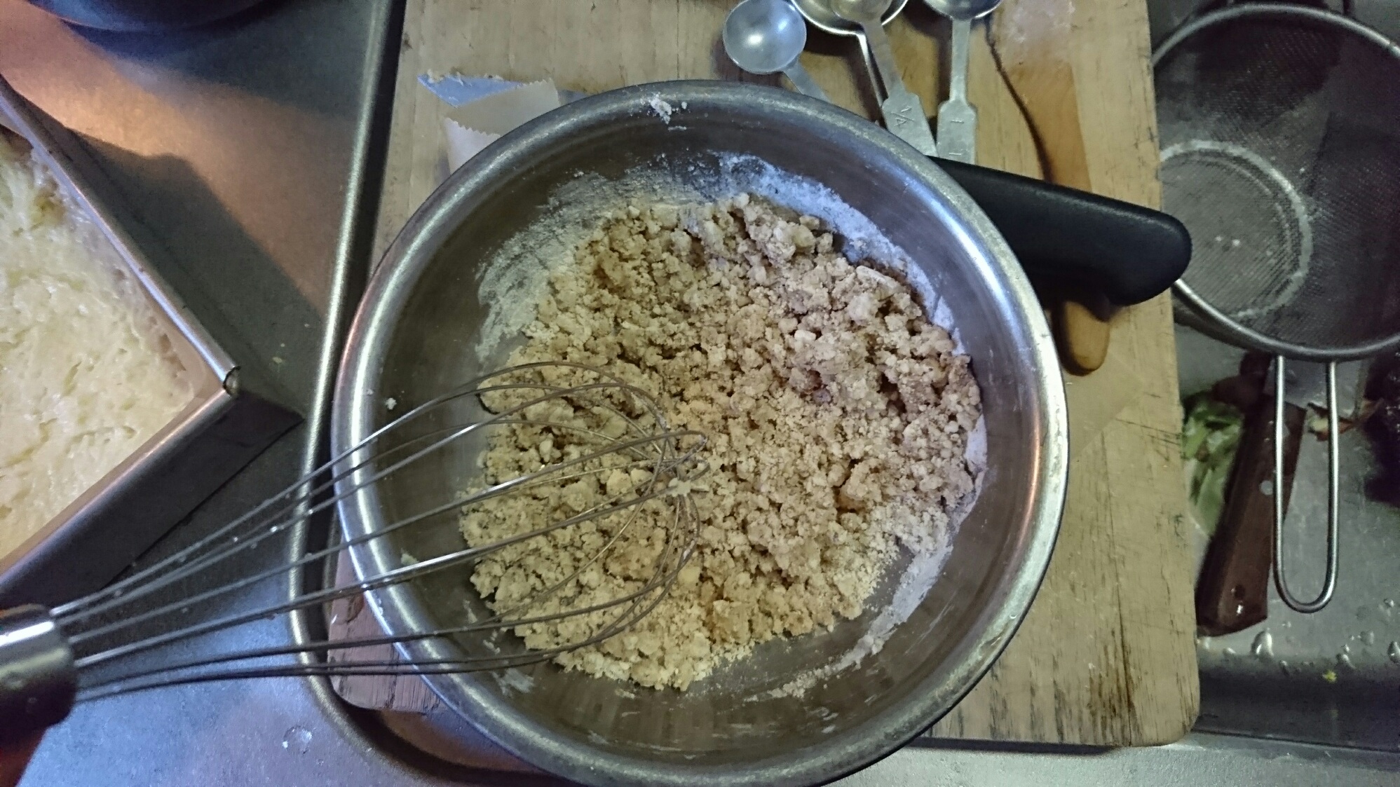 クランブルの溶かしバター以外の材料を混ぜてから、溶かしバターを加えてぽろぽろになるように混ぜます。泡だて器などで。