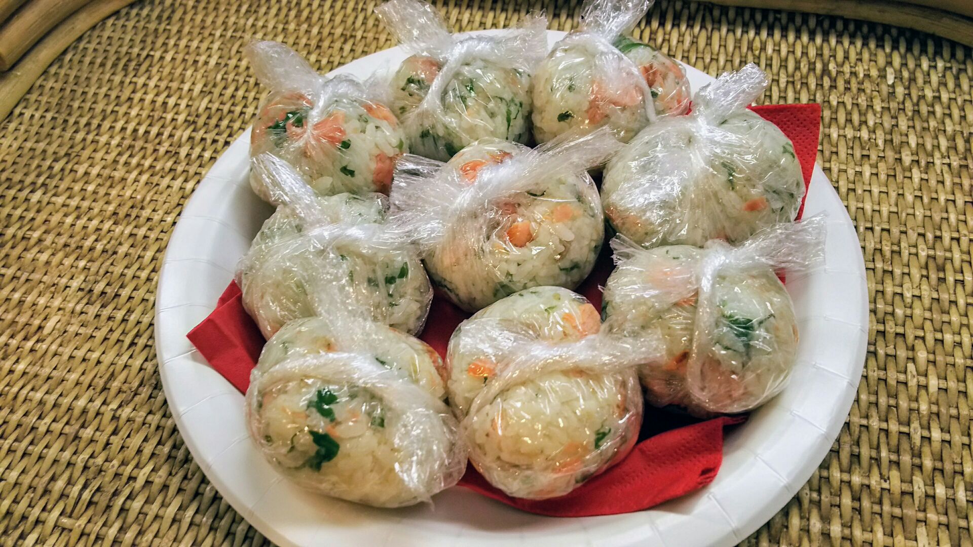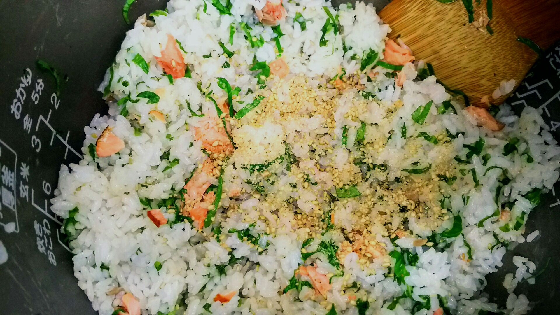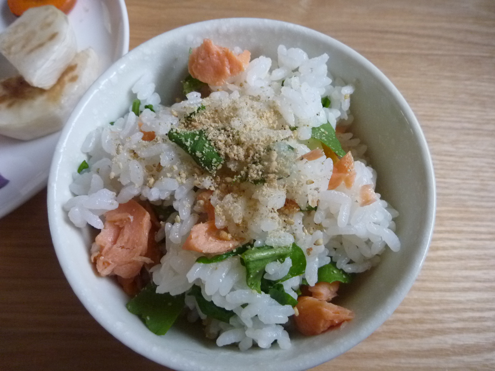 1、まず塩鮭(甘塩)を焼いてかるくほぐす。