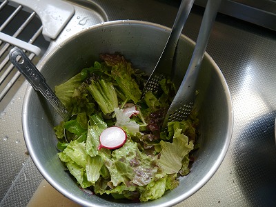 ラディッシュはスライス、その他はちぎってオイルと酢、塩こしょうとあわせます。