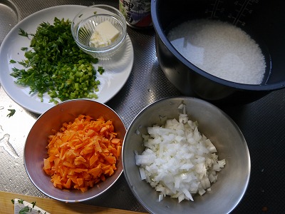 バターをのせて、酒大さじ1、塩こしょうをいれて炊飯器におまかせ。