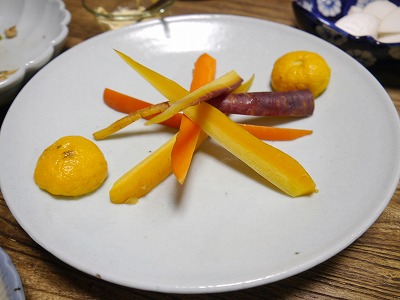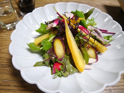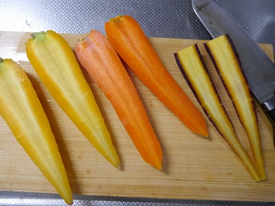 ラディッシュの赤、ニンジンの黄と紫がきれい。