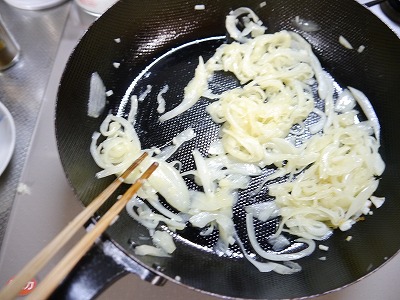 ニンニクみじん切り(1片)をオリーブオイルで炒め、香りがたったら玉ねぎも加えてよく炒めます。
