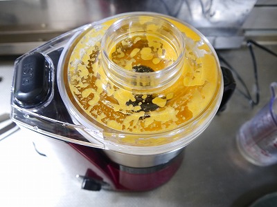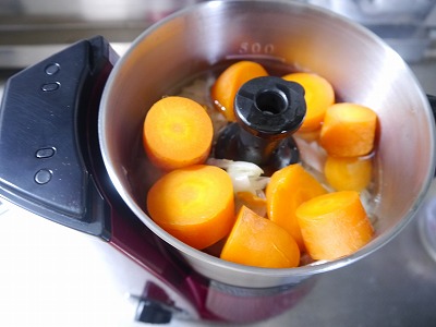炒めた玉ねぎ、ニンジン、洋風だし(300ccくらい・今回は水)をフードプロセッサーへ。