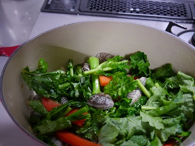 のこりの野良坊菜とアサリを入れて酒を入れ、塩少々をします。