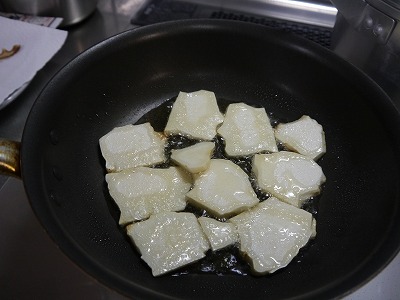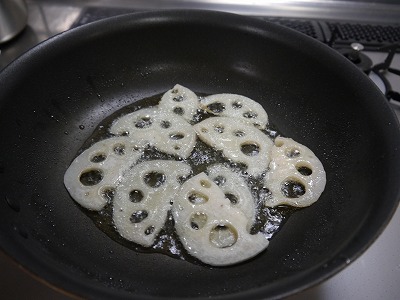 フライパンにサラダ油を熱して、あとは揚げるだけ。ジュワ~