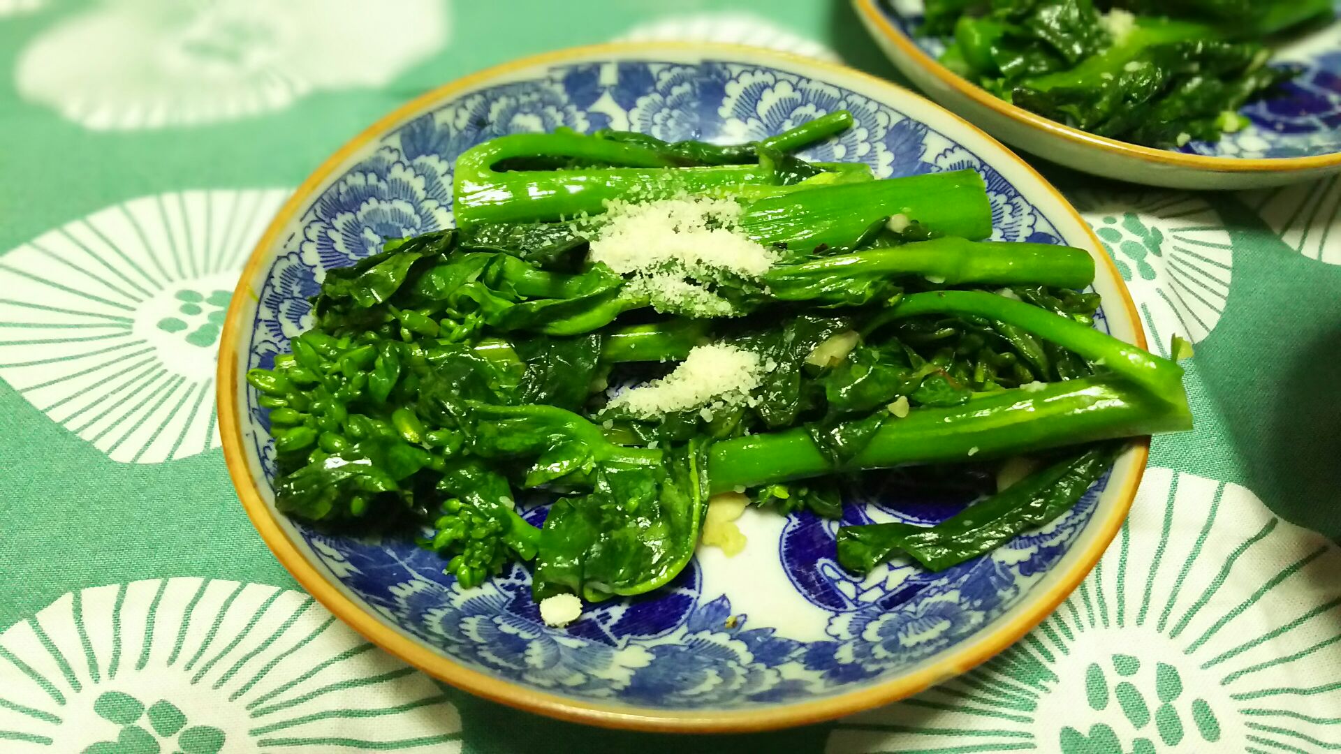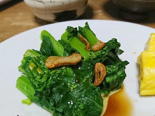 少し冷めたら、しょう油、お酢をくわえまぜ、茹でた菜の花にかける。