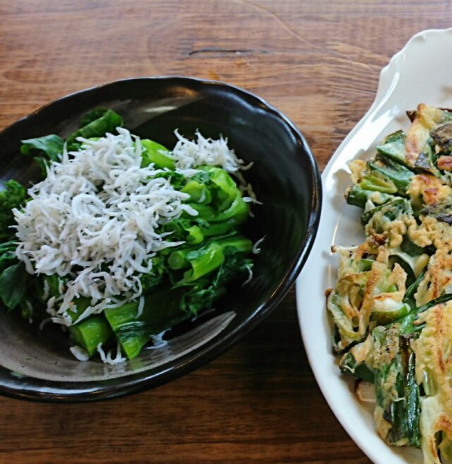 ちょうど菜の花の頃、旬のやまこも大好きなしらすをのせて。