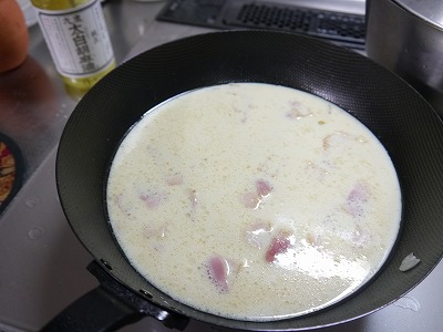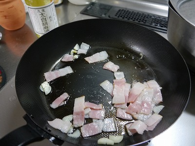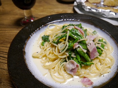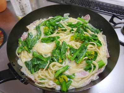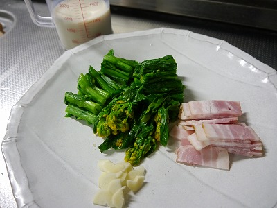 茹でた菜の花、ベーコン、ニンニク、無調整豆乳。(パスタ140グラム)