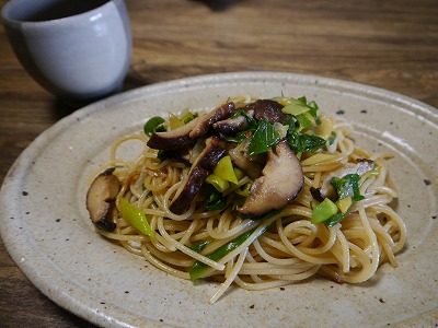 ゆでたてのスパゲッティを加えたら最後にすこしお醤油を。