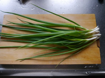 こちら、まな板の上の小ねぎです。小口切りにしていきます。