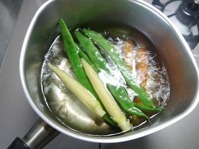 茹でているのはヤングコーンとまびき人参。